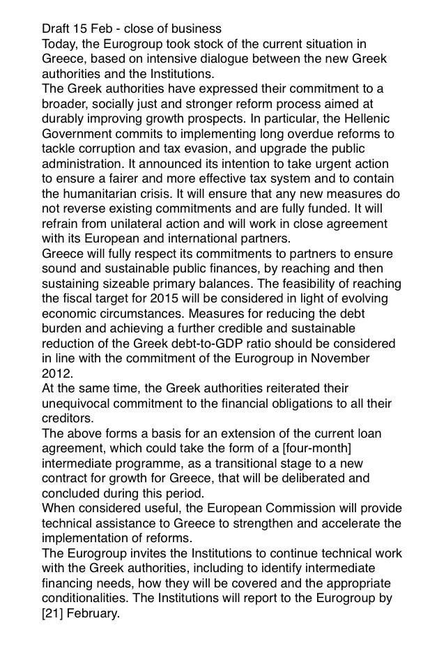 Τα παραπάνω σχηματίζουν μια βάση για μια επέκταση της τρέχουσας δανειακής σύμβασης, που θα μπορούσε να λάβει τη μορφή ενός [τετράμηνου] ενδιάμεσου προγράμματος, ως μεταβατικό στάδιο προς ένα νέο σύμφωνο για την ανάπτυξη για την Ελλάδα, που θα εξαχθεί και ολοκληρωθεί σε αυτή την περίοδο.
